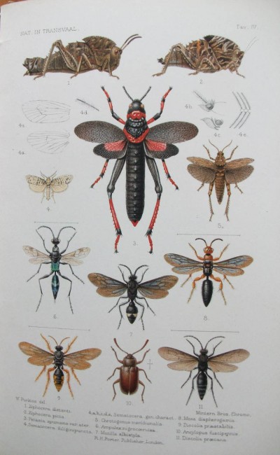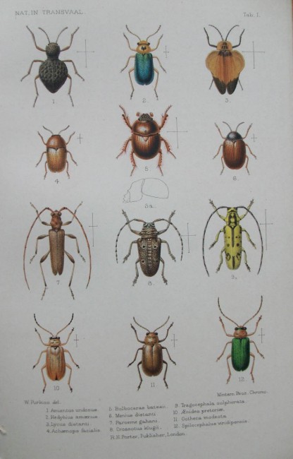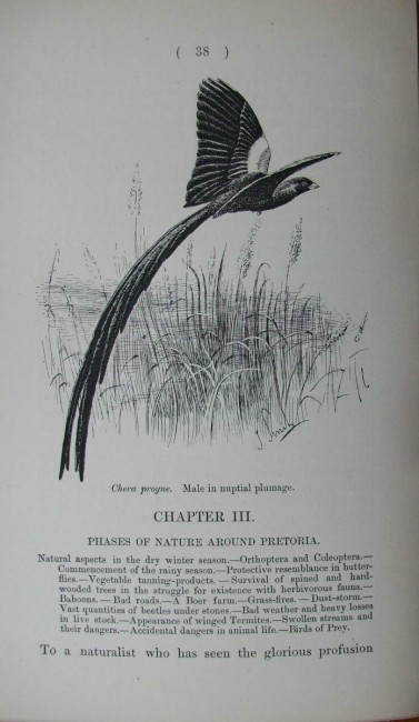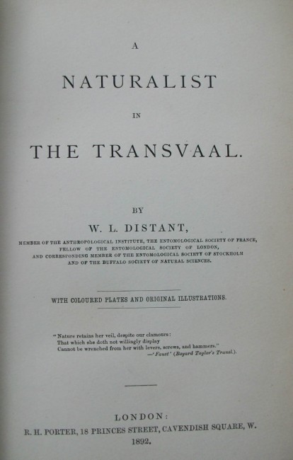 The impressions of a naturalist who, during a twelve months' business sojourn in the Transvaal, employed the whole of his leisure in zoological recreation". The author sailed for the Cape in June 1890, and visited the South African Museum, which was presided over by his friend Roland Trimen, remarking, "It leaves nothing to be desired but greater space and more available funds for the acquistion of fresh specimens." One can form no adequate conception of the South African fauna from the present compulsory crowded contents of this building." On his arrival in the Transvaal he found the country suffering severely from the collapse of the "1889 Boom," and observes, "Johannesburg is now in sackcloth and ashes, the occupation of the company promoter is gone, mining companies close down almost daily, mining script is nearly valueless, and a settled apathy denotes the shareholder."
