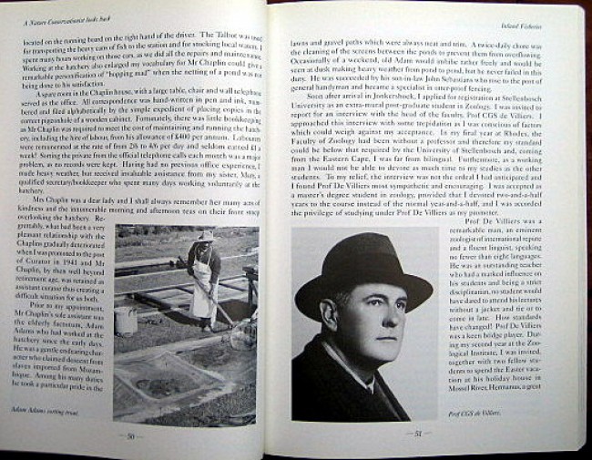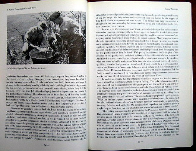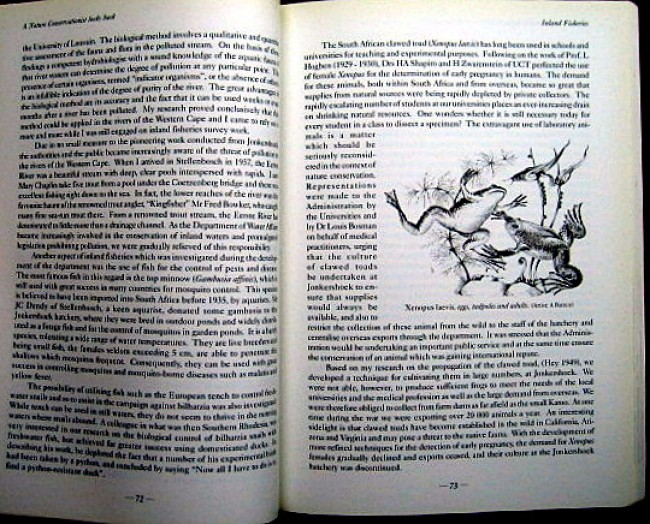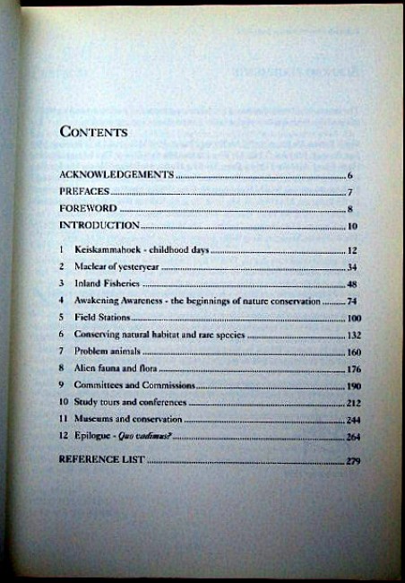 Douglas Hey was born on 23 November 1914 in East London and grew up in the Eastern Cape. His father was Sydney Hey, a postmaster and author of the now classic book, The Rapture of the River. After matriculating from Maclear High School he studied Zoology and Chemistry at Rhodes University (BSc) and Stellenbosch University (MSc and D Sc, both cum laude, 1942). He taught for a year at Lovedale College in the Eastern Cape and then worked as a researcher at the Jonkershoek Hatchery in Stellenbosch and at Leuven University in Belgium.1942: Director of Inland Fisheries1949: Diplomas in Limnology, Hydrobiology and Pisciculture from the University of Louvain, Belgium.1952: Director of Nature Conservation of the Cape Province1959: Study Tour of the United States on an American Leader Exchange bursary1970: Visiting Professor to Colorado State University1972: planned and helped install a degree course in Nature Conservation at the Department of Forestry, Stellenbosch University, where he lectured.1974: Visiting Professor to Utah State UniversityDouglas Hey retired as Director of Nature Conservation of the Cape Province in November 1979. He was a fellow and the treasurer of the Royal Society of South Africa, an active member of the Council of the Zoological Society and served on the Boards of Trustees of a number of organizations, among them the South African Museum and the National Botanic Gardens.Douglas Hey died on 18 March 2008.'My father's early love of nature arose from a childhood spent in the small towns of the Eastern Cape, where my Grandfather, Sydney Hey, a postmaster in his professional life, spent his free time angling in the rivers and fresh-water streams, and gathering material for his now classic work, The Rapture of the River. After completing his zoological studies and research at Rhodes and Stellenbosch Universities, my father started his career in Inland Fisheries in the beautiful Jonkershoek Valley near Stellenbosch, also spending time studying limnology in Belgium and the fisheries projects in the Belgian Congo. In 1952, the new Department of Nature Conservation of the Cape Province was founded, with my father as first Director. A position which he held until his retirement in November 1979. This was followed by a brief period as head of the National Monuments Council. During these years, in which numerous nature reserves and natural areas were proclaimed throughout the Province, my father paid particular attention to public education, with his attractive pocket-sized field guides on protected Fauna and Flora. We should briefly try to recall the size of the Cape Province at the time, stretching to Kokstad, Matatiele and Swartberg in the East, and to the banks of the Orange River in the North. My father's regular tours of inspection thus entailed a huge amount of driving over his 28 years as Director. Some may still recall his popular radio programme Talking of Nature, shared with a team of naturalists which included Dr. Geoff McLachlan and the late Professor Gerrie Broekhuizen of UCT, his regular column entitled Bewonder en Bewaar in Die Burger, and his many popular books on nature, produced in both English and Afrikaans, including Wildlife Heritage (Natuurerfenis), and Water, Source of Life (Water Betower My), to name just two - books in which my late Mother, who was far more punctilious in matters of grammar and syntax, played an important role. I should mention that Mrs. Eileen Kent, who is present with us to-day, rendered my father invaluable editorial assistance with Water, Source of Life. Included in his brief of Nature Conservation was museum services, where he introduced the sensible recommendation that each museum, rather than attempt to build general collections, should aim to represent aspects unique to the particular area in which it is situated. Thus we have, for example, the 1820 Settlers' Museum in Grahamstown, the Shipwreck Museum in Bredasdorp, the Museum of Farming Implements and Equipment at Albany.My father's gifts in this area were, however, not those of the historian but of an efficient and imaginative organiser, a builder of successful teams and scientific collaboration. In the course of his work, friendships arose with a number of remarkable people, such as the naturalist Dr. S. H. Skaife of Hout Bay and, at the East London Museum, Dr. Marge Courtenay-Latimer, the discoverer of that lost species of primaeval fish, the caelacanth [She is a leading personality in a wonderful book, by the way, A Fish Caught in Time].I should also mention here his services to the international cause of Nature Conservation through a long association with the World Wildlife Fund (WWF), whose foundation came about in part through the efforts of the late Dr. Anton Rupert. My father's work was well recognised through the receipt of numerous medals and awards, both from this country and from overseas, which included the Cape Tercentenary Foundation medal, the freedom of the City of Cape Town, and the State President's Award for Meritorious Service. I shall not attempt a list of these here, but rather mention that he considered these as awards, not so much to himself alone, but to the teams of enthusiastic co-workers and colleagues which he had built up throughout the years. Towards the end of his official career in Nature Conservation, he was particularly proud of the service which he was able to render to this city through the Table Mountain Commission of 1978, and its report of recommendations for the preservation of the entire Table Mountain chain right down to Cape Point.'From the valedictory address by John Douglas Hey, 26 March 2008