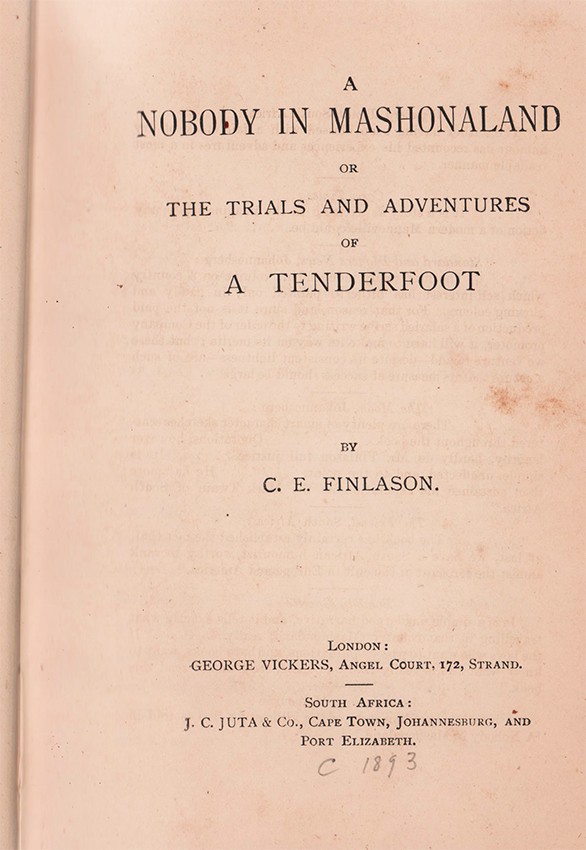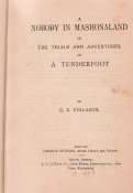Mendelssohn (Sidney) South African Bibliography volume 1 page 546: "A Nobody in Mashonaland" was a very well-known journalist and amateur cricketer in Kimberley, where he was on the staff of the now long defunct Daily Independent. The volume is written in a humorous and entertaining manner, and the hardships, dangers, and privations encountered in the early days of the settlement are depicted in a most graphic style. The chapter on Lord Randolph Churchill shows that somewhat eccentric nobleman in a not altogether attractive light, and the transient glimpse of Mr. Rhodes is as distinct as a silhouette.