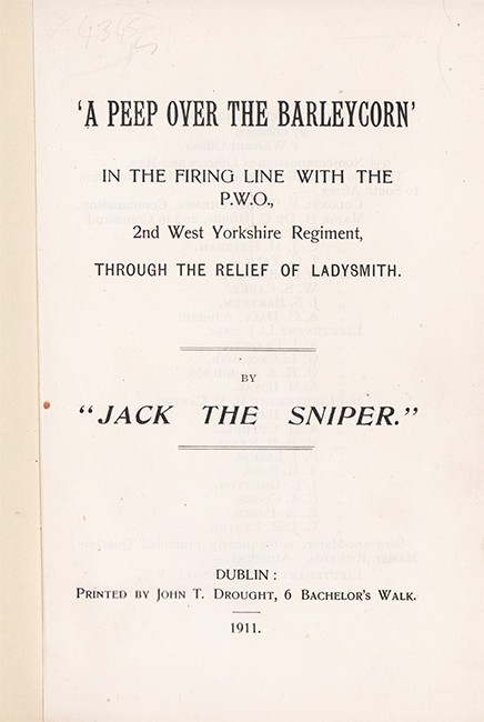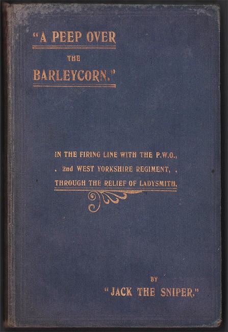 Hackett (R.G.) South African War Books page. 63: 'Recollections of service with the 2nd Batt. West Yorkshire Regiment in South Africa. The 'barleycorn' mentioned in the title refers to the foresight of a Lee-Metford rifle'.