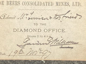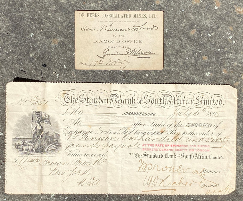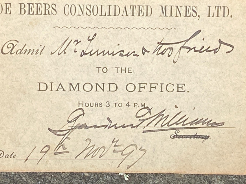 A printed and manuscript pass, on thin light grey card pass ‘De Beers Consolidated Mines, Ltd./ Admit Mr. Tunison & two friends / to the / Diamond Office. / Hours 3 to 4 p.m. / Gardner F. Williams / Date 19th Novr. 97’ 2 3/8 x 3 5/8in; 60 x 92mm.