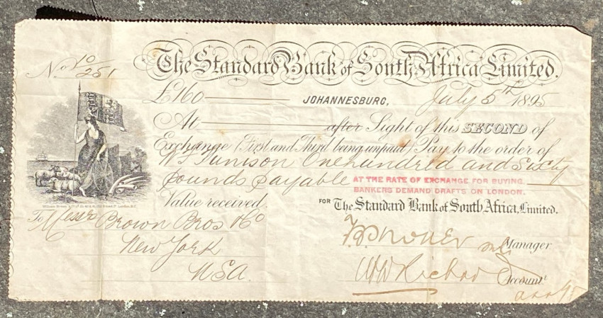 [with:] a related bill of exchange, for 160 pounds, issued by The Standard Bank of South Africa, directed to ‘Messrs. Brown Bros & Co. of New York.