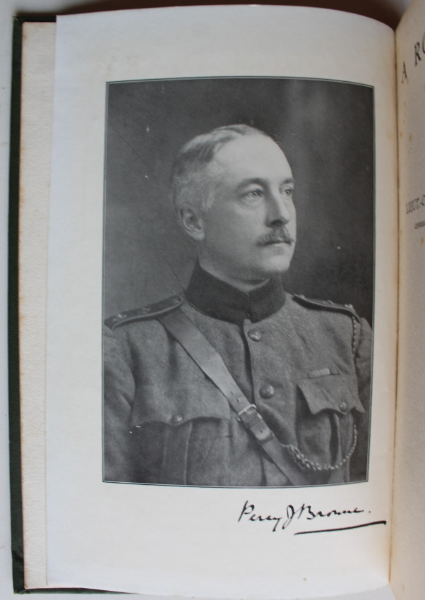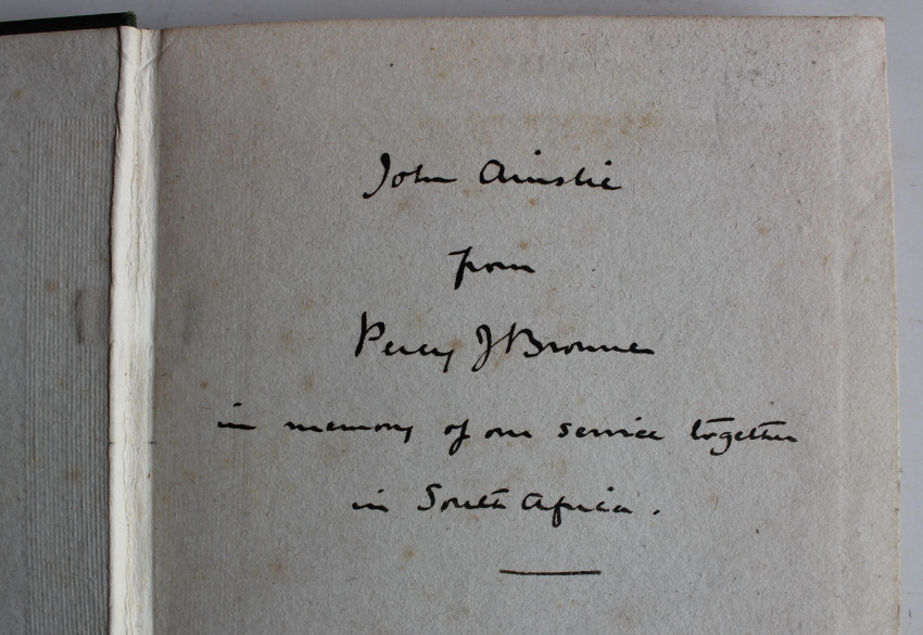 Browne commanded the 7th Battalion Imperial Yeomanry South Africa 1900-1901. An INSCRIBED copy of a scarce title. 72 pages. In green cloth with title to the spine. Frontispiece of Browne. Some light foxing on the first 3 pages. Inscribed on the front, free, endpaper: "John Ainslie from Percy J. Browne in memory of our service together in South Africa".