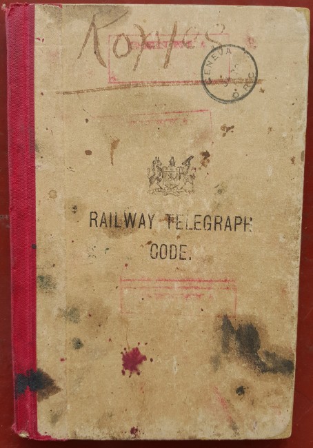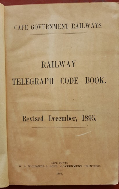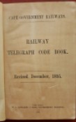 Cape Government Railways - Railway telegraph code book, revised, December 1895. W.A.Richards and Sons, Cape Town. 111p. Hard cover with red cloth spine. Join to spine on back cover is weak but not torn. Stamps and marks to front cover.