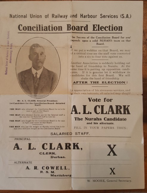 National Union of Harbour and Railway services - conciliation board election voting leaflet. Vote for A.L. Clark. Stamped with National Union of Railway and Harbour Services, Johannesburg.