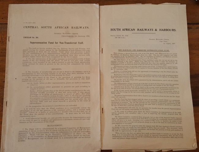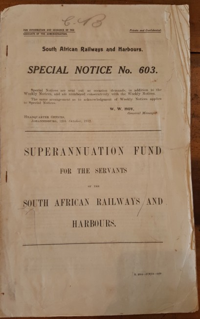 Special Notice No. 603, Johannesburg 12th October 1912. 20p. Stapled leaflet detailing superannuation fund for the servants of the South African Railways and Harbours.