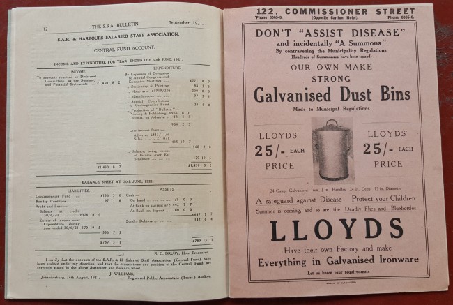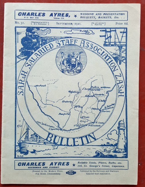 South African Railways and Harbour Staff Association Bulletin - No.31 September 1921, soft cover brochure. 28p. In very good condition with no tears.