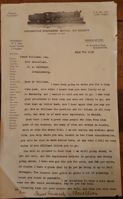 Letter dated 7th July 1926 from General Secretary J Donaldson of Locomotive Engineers Mutual Aid Society to James Williams, Assistant accountant of SA Railways, Johannesburg.
