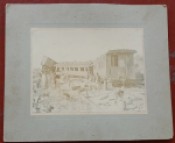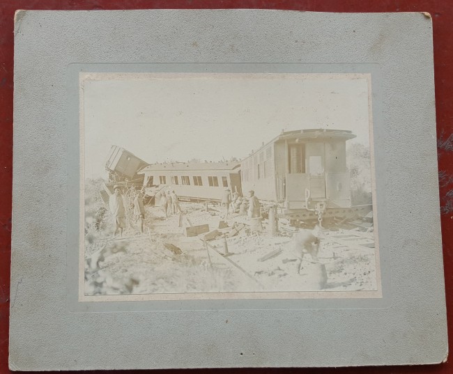 Black and white photograph of train crash, stamp on back reads Mignon Studio, Delagoa Bay. n.d. Faded and slight foxing.