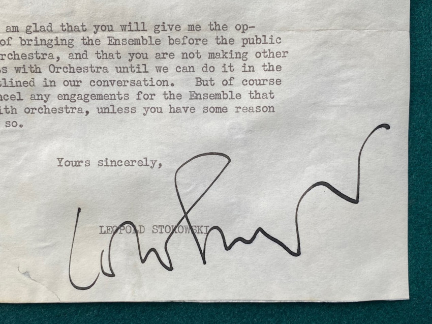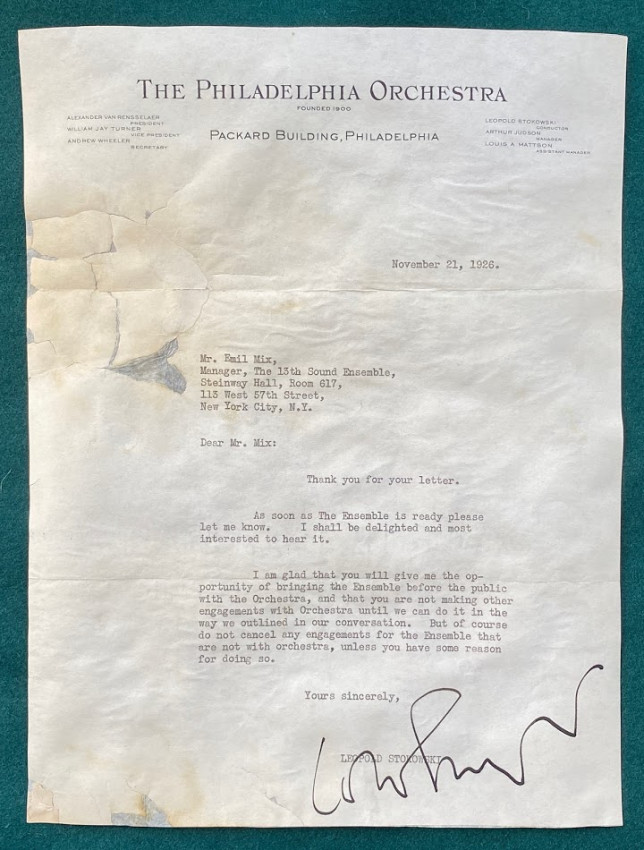 1.Leopold STOKOWSKI. 1p. typed letter signed to Emil Mix “Manager, The 13th Sound Ensemble”, 21 November 1926, on ‘Philadelphia Orchestra’ headed paper “… As soon as The Ensemble is ready please let me know. I shall be delighted and most interested to hearit. I am glad that you will give me the opportunity of bringing the Ensemble before the public with the Orchestra, and that you are not making other engagements with the Orchestra until we can do it in the way we outlined in our conversation…” Condition: laid down with small voids to blank margins.