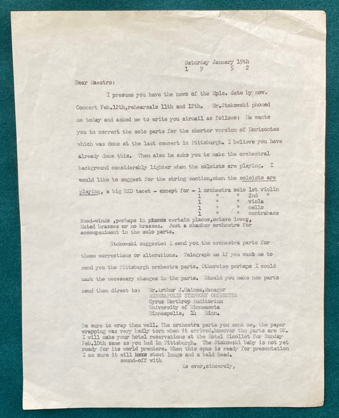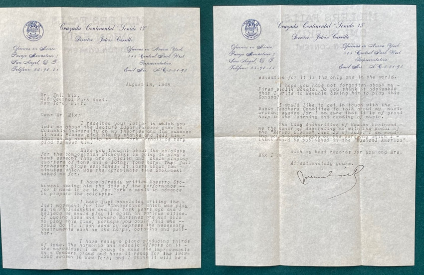 5.Emil MIX. Two typed retained copies of letters to Carrillo, 6th August 1948 & 19th January 1952, the first reporting on a lecture given by Edgard Varèse at Columbia University in New York (a success), the second concerning proposed alterations to an upcoming concert, with suggestions from both Mix and Stokowski (“Mr. Stokowski phoned me today”).