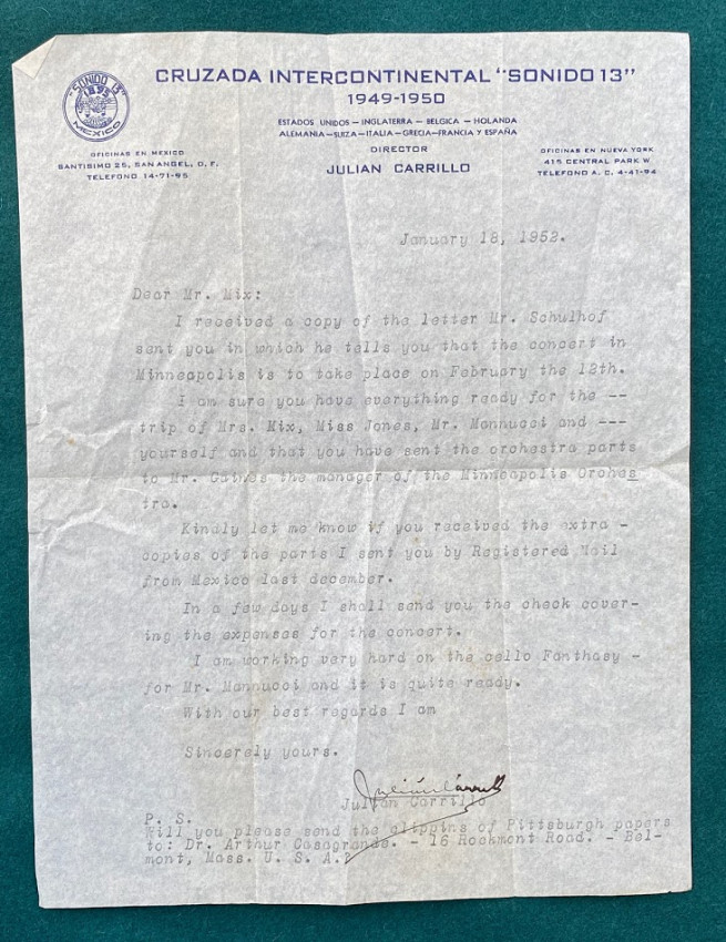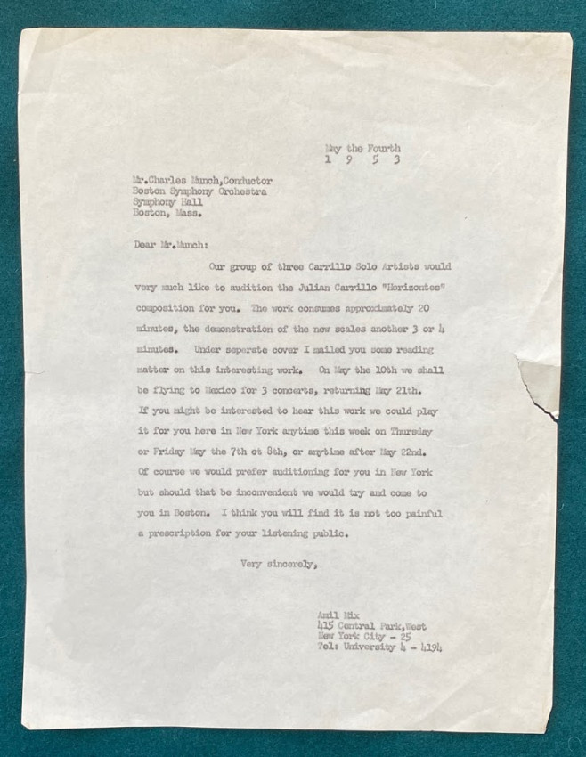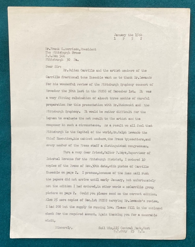 6.Emil MIX. Two typed retained copies of letters, 15 January 1952 & 4th May 1953, the first to the president of the Pittsburgh Press asking for copies of the Pittsburgh Press, the second to Charles Munch, conductor of the Boston Symphony Orchestra ‘Our group of three Carrillo Solo Artists would very much like to audition Julian Carrillo’s “Horizontales” composition for you.’