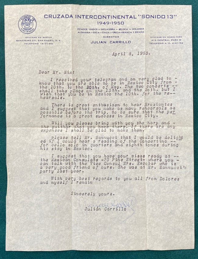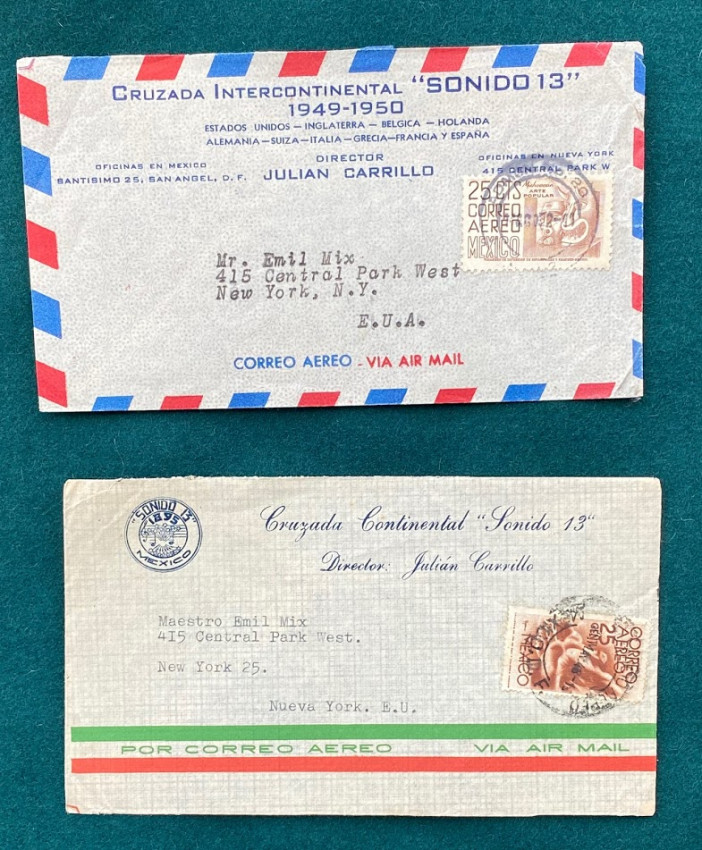 4.Julián CARRILLO. A collection of four typed letters signed to Emil Mix, on ‘Cruzada … “Sonida 13”’ headed paper, dated Mexico, 18 August 1948 – 8 April 1953, concerning musical matters (see images) and the propagation of Carrillo’s ‘Sonido 13’; with two related envelopes addressed to Mix.