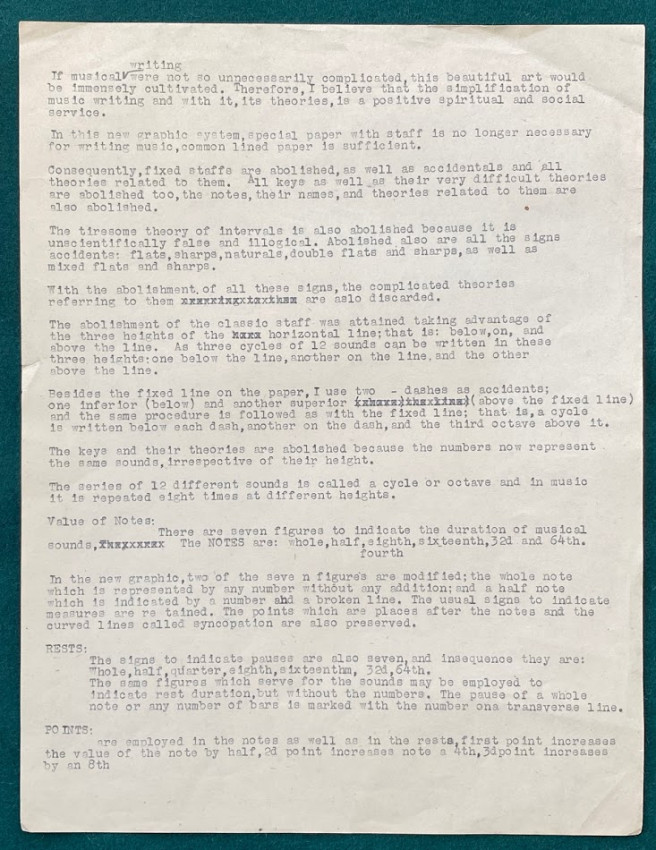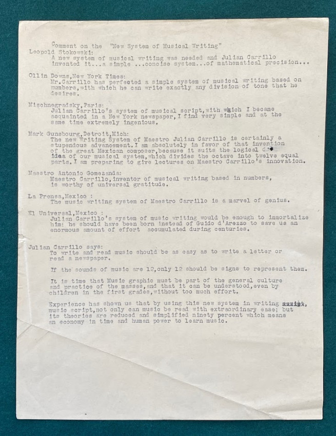 3.[Julián CARRILLO, and others] 2pp. of typed notes on Carrillo’s ‘Sonido 13’ system together with a group of ‘Comments on the “New System of Musical Writing”’ by Stokowski, Ollin Downs, ‘Mischnegradsky’ [i.e. Ivan Wyschnegradsky] and others. [Undated].