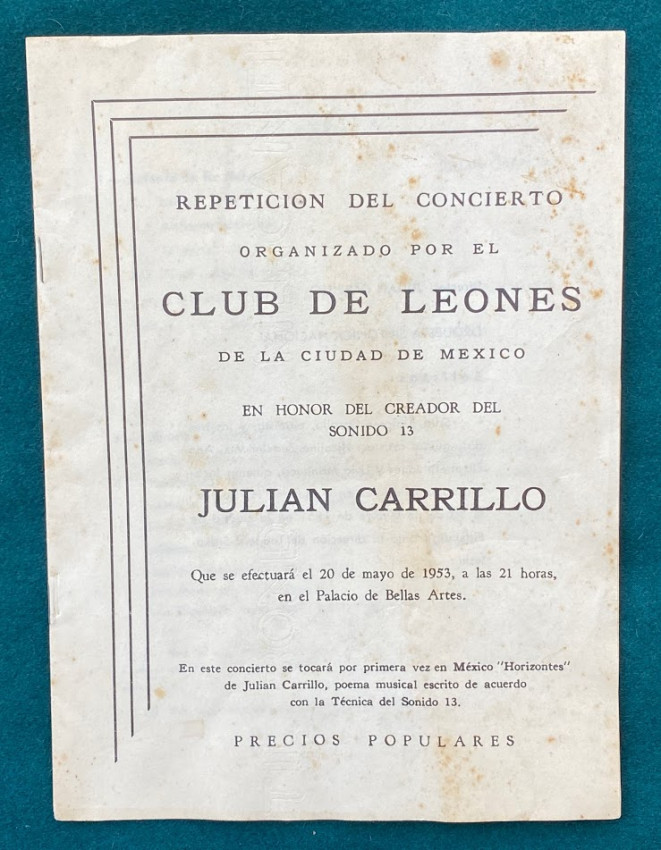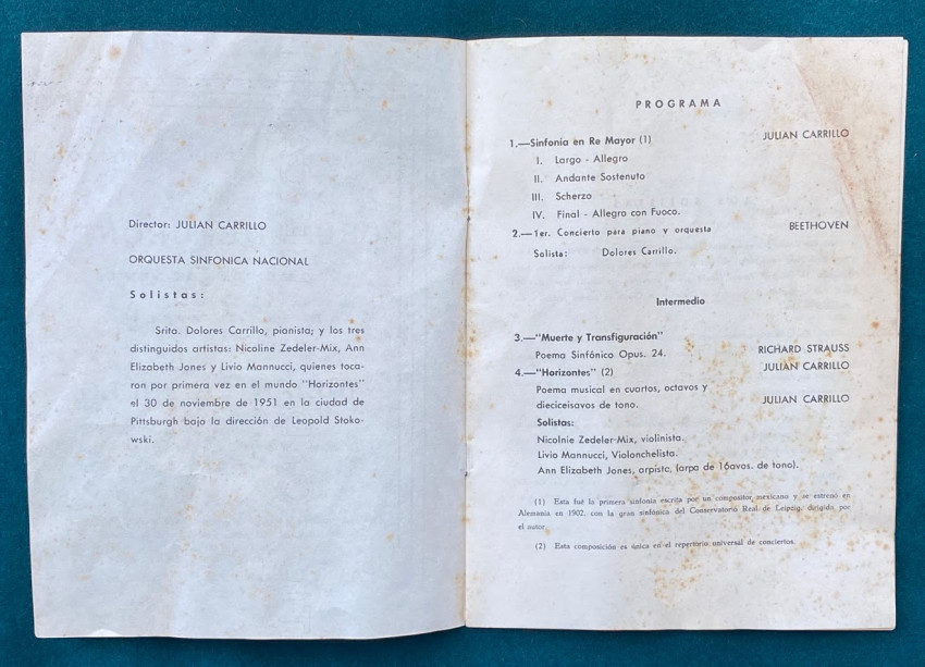 7.Julián CARRILLO & Nicoline ZEDELER-MIX. An 8pp. programme ‘Repeticion del Concierto organizado por el club de leonis de la ciudad de Mexico en Honor del creador del Sonido 13 Julian Carrillo que se efectuara el 20 de mayo de 1953 … en la Palacio de Bellas Artes.’ This concert marked the Mexican premiere of Carrillo’s “Horizontes”. The violin soloist here and at the world premiere in Pittsburgh on 30 November 1951 was Nicoline Zedeler-Mix, wife of Emil.
