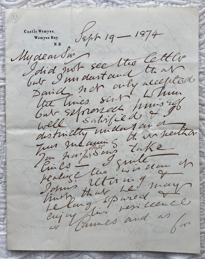 5.Sir John Burns (1829-1901). A 3pp. ALS from Burns to Charles MacIver ‘My Dear Sir’, on Castle Wemyss headed paper, dated ‘Sept 19 1874’, quarto, bifolium, written when Charles took the decision to retire, supporting him in this, saying how pleased he is with David MacIver, and discussing a related matter ‘I think Mr Inman’s letter to the Conference is very forcible and his view of differential rates very sound ..’ *John Burns took over from his father, Sir George, in 1860, and was instrumental in the continuing success of the Cunard Line.