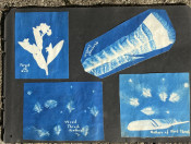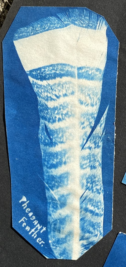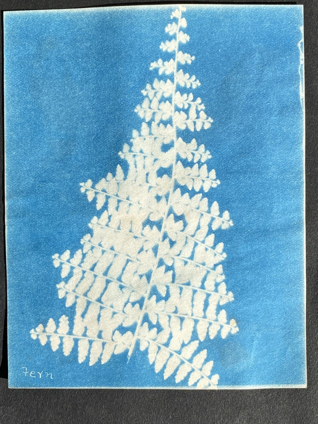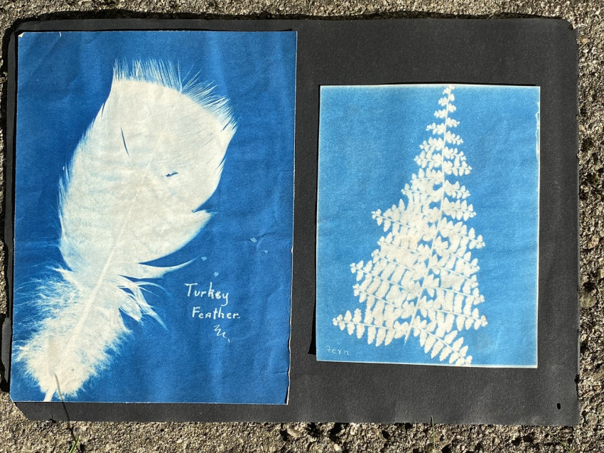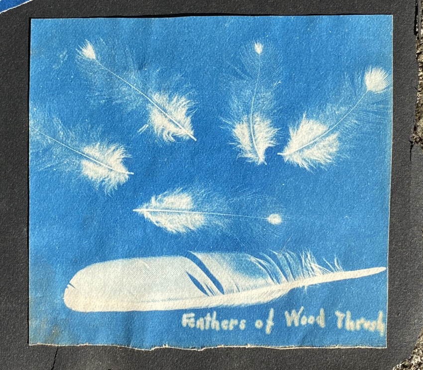 A small collection of six cyanotype contact prints, titled 'Turkey Feather'; 'Pheasant Feather'; 'Wood Thrush Feather'; 'Feathers of Wood Thrush'; 'Fern' and 'Forget Me Not'. [Possibly Bethlehem, Pennsylvania: undated but circa 1912-1915]. 6 prints (6 1/2 x 5in; 166 x 127mm. and smaller) mounted on two sheets removed from an album [see the previous lot]. Provenance: Ursula L. Vogt (of Utica, New York. Removed from an album compiled by Ursula whilst attending the Moravian College, Bethlehem, Pennsylvania).