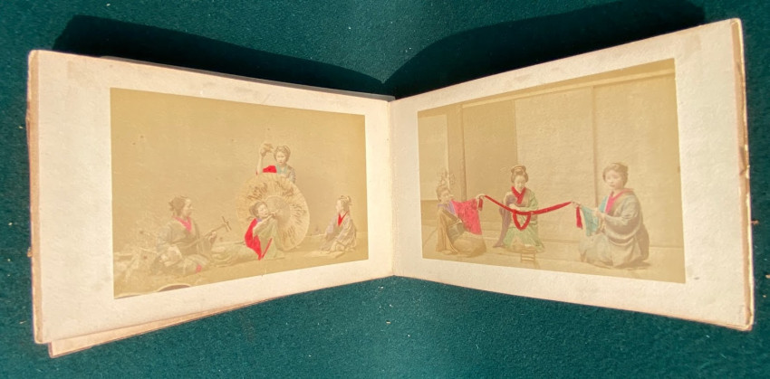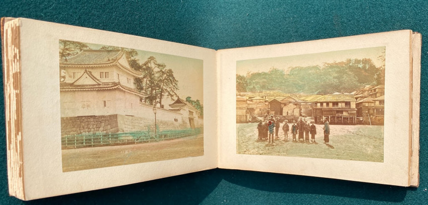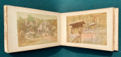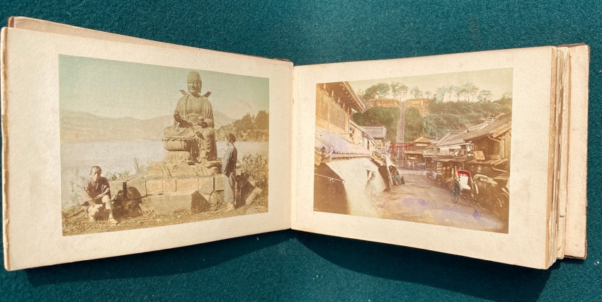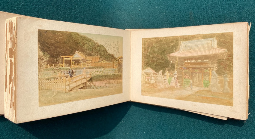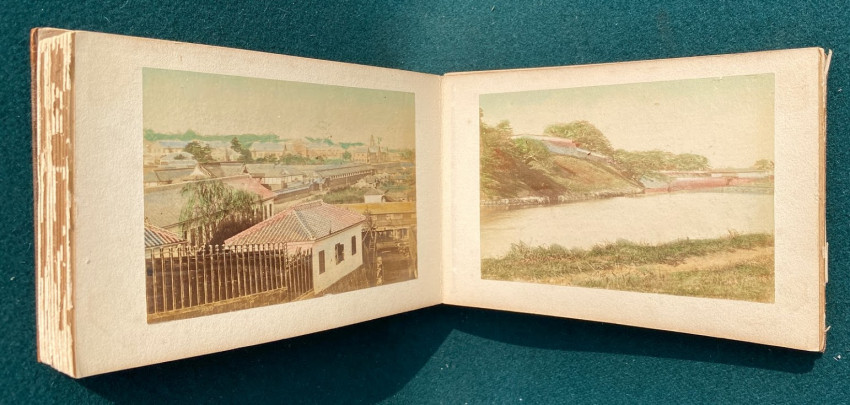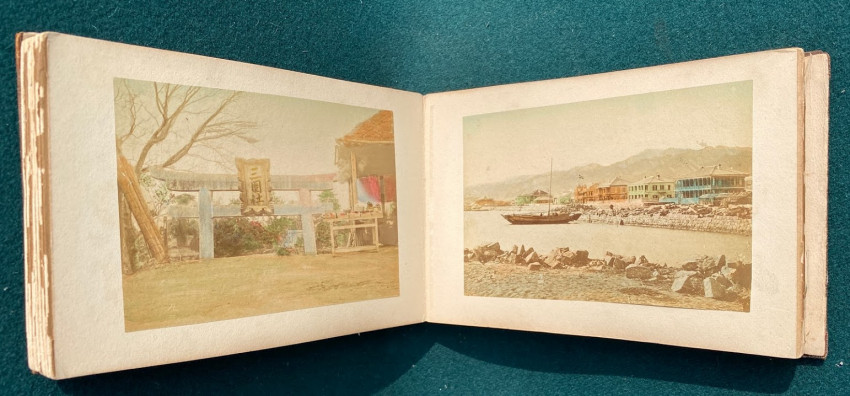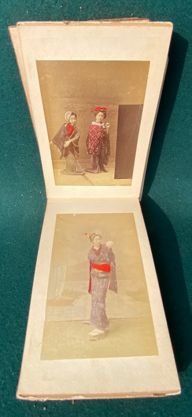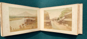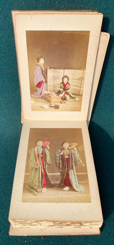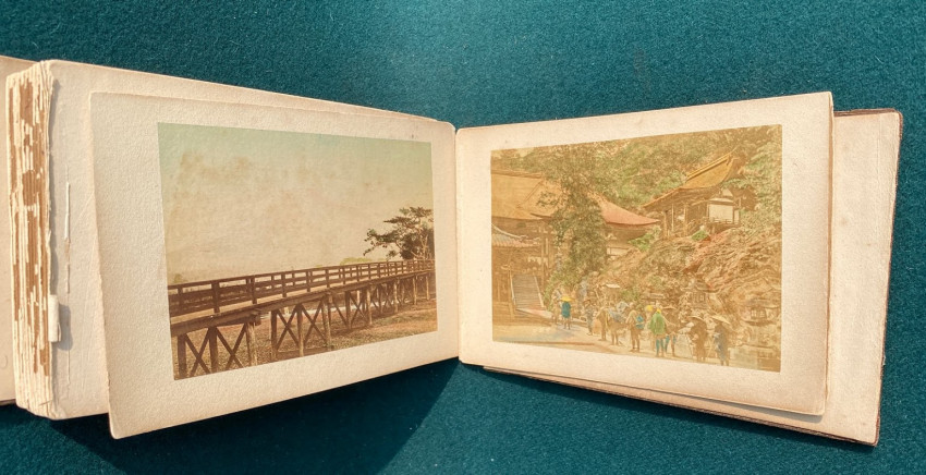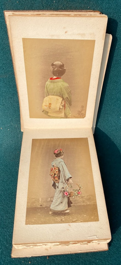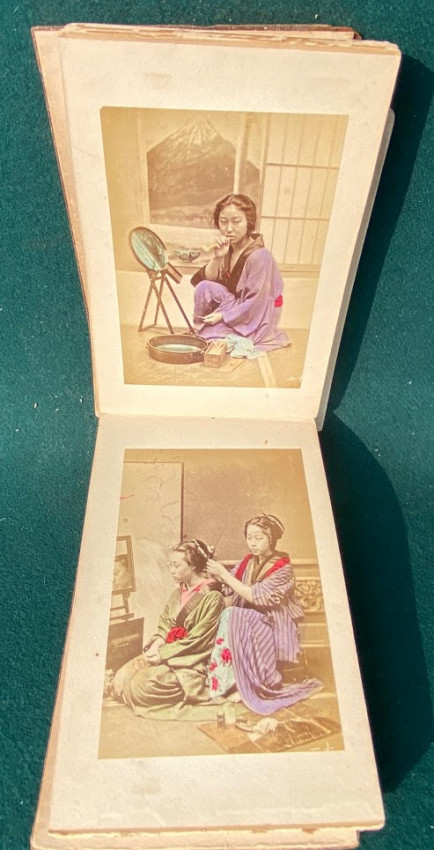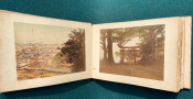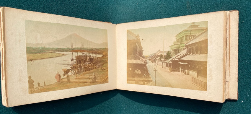 A small concertina album of 50 mounted hand-colored photographs. [Japan: c.1890-1900?]. Octavo (7 1/2 x 4 5/8in; 190 x 117mm). 50 hand-colored albumen prints (c. 5 1/4 x 3 5/8in; 133 x 92mm) from glass negatives (25 images of Japanese women in traditional dress and 25 topographical views of Japan). (Some fading [see images], some of the concertina joints broken) Contemporary brocaded cloth covered boards (worn, detached).