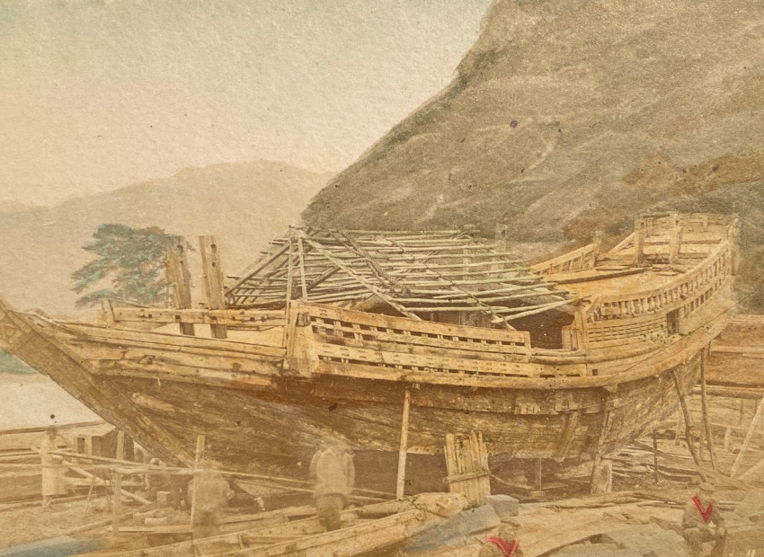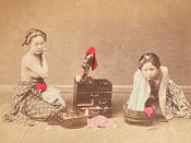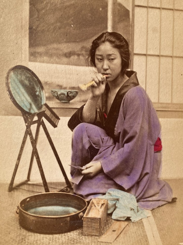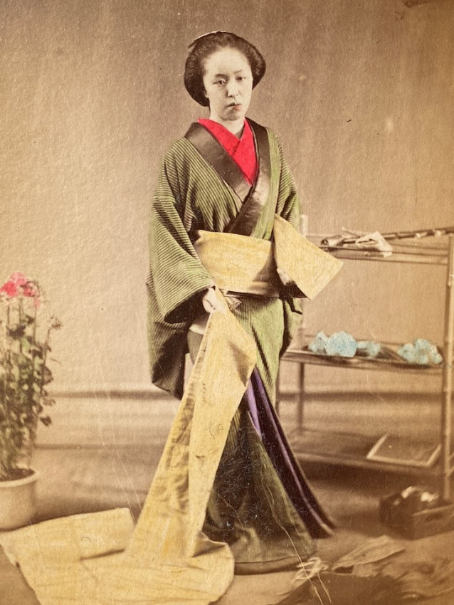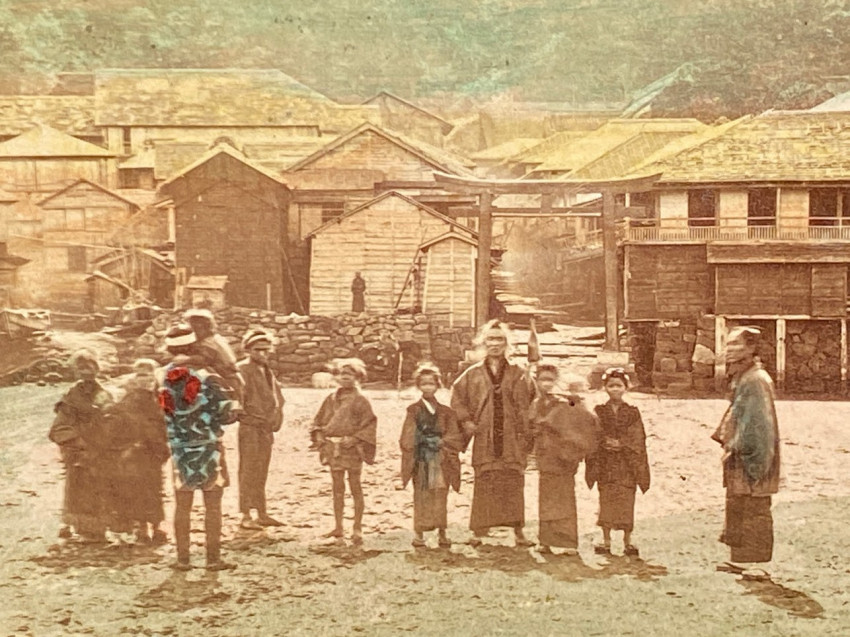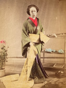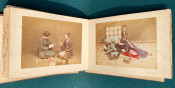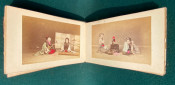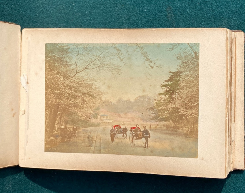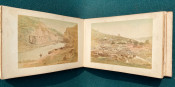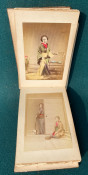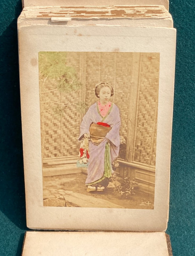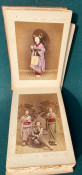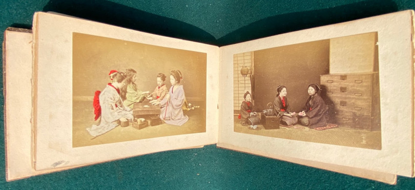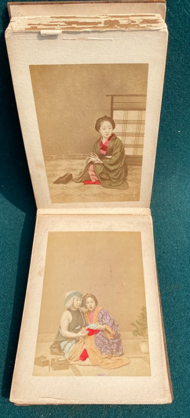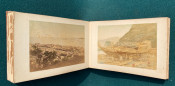 A small concertina album of 50 mounted hand-colored photographs. [Japan: c.1890-1900?]. Octavo (7 1/2 x 4 5/8in; 190 x 117mm). 50 hand-colored albumen prints (c. 5 1/4 x 3 5/8in; 133 x 92mm) from glass negatives (25 images of Japanese women in traditional dress and 25 topographical views of Japan). (Some fading [see images], some of the concertina joints broken) Contemporary brocaded cloth covered boards (worn, detached).