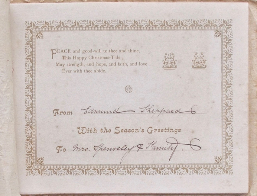 14pp with 12 black and white full page illustrations. Very good to very good (+) publisher’s original light blue card covers with titles in gilt on the front cover and a pink silk tie on the left hand edge. Light foxing to the first page which is a Christmas greeting with the sender’s signature and dedication. All twelve illustrations are in very good (+) condition with no foxing, marks or other blemishes. Rare. No other copies currently offered for sale nor could I find a copy in any library