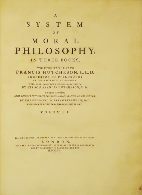 In Three Books; written by the late Francis Hutcheson, L.L.D., Professor of Philosophy in the University of Glasgow. Published from the original manuscript by his son Francis Hutcheson, M.D. To which is prefixed some account of the life, writings, and character of the author, by the Reverend William Leechman, D.D., Professor of Divinity in the same university.