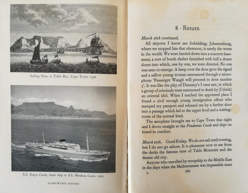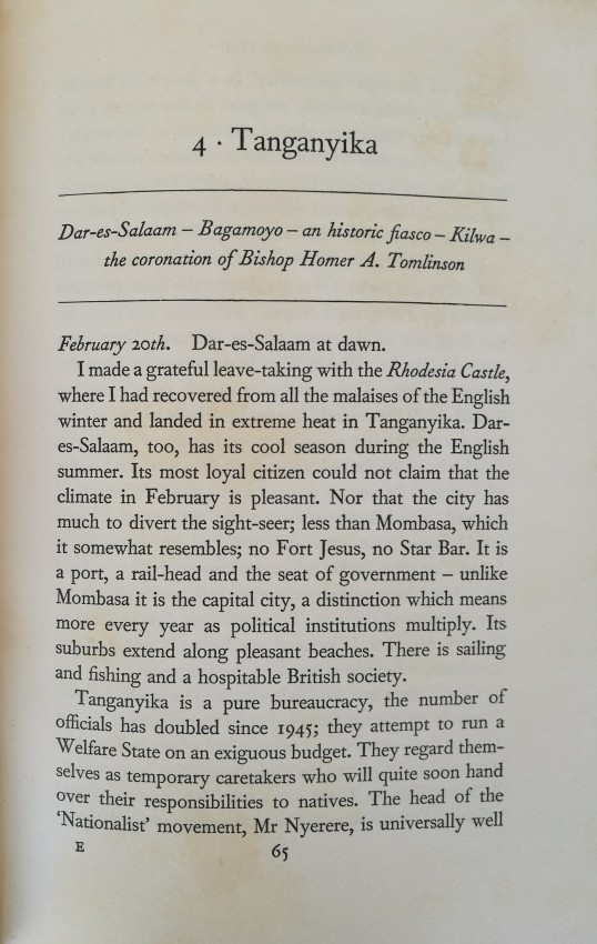 This well-known author left England for two months in early-1959, sailing in the Rhodesia Castle for Dar es Salaam (20 February) and returning by the Union Castle line's new flagship, the Pendennis Castle, on her first voyage from Cape Town on 27 March, "[with] exactly five weeks in which to wander down by land". The book is his perceptive and illustrated non-political diary, with many backward glances.
