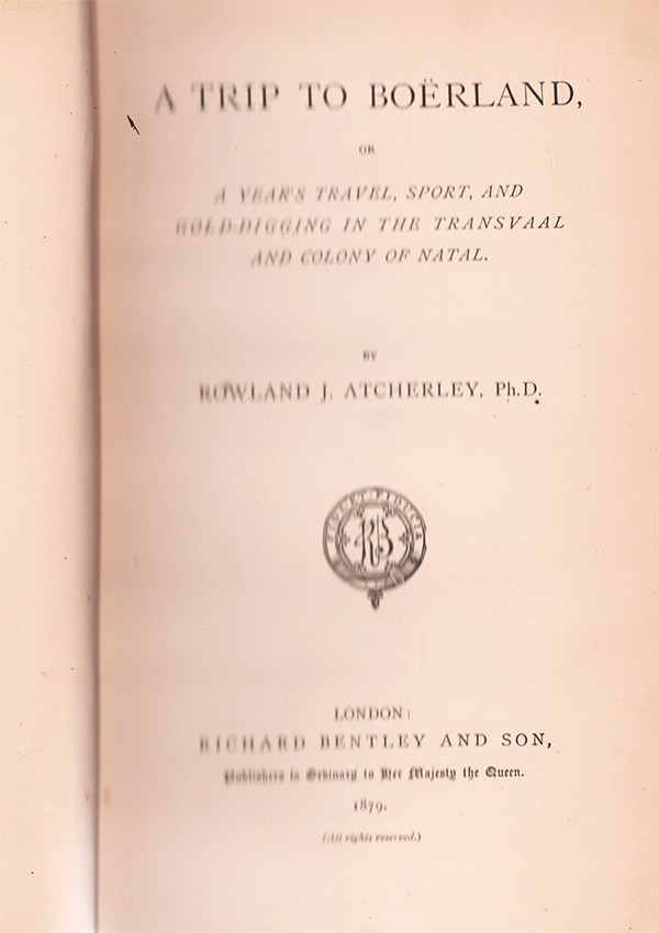 Mendelssohn (Sidney) South African Bibliography volume 1 page 55: This work describes a visit to the Transvaal, &c, in 1877-8. The author does not appear to have been successful as a digger or a speculator, but his experiences at Spitz Kop and Pilgrim's Rest fairly describe the life of the alluvial diggers at that period. Mr Atcherley evidently believed the Boers were unjustly treated, and his non-success in negotiating with the British authorities in the Transvaal seems to have embittered his views.