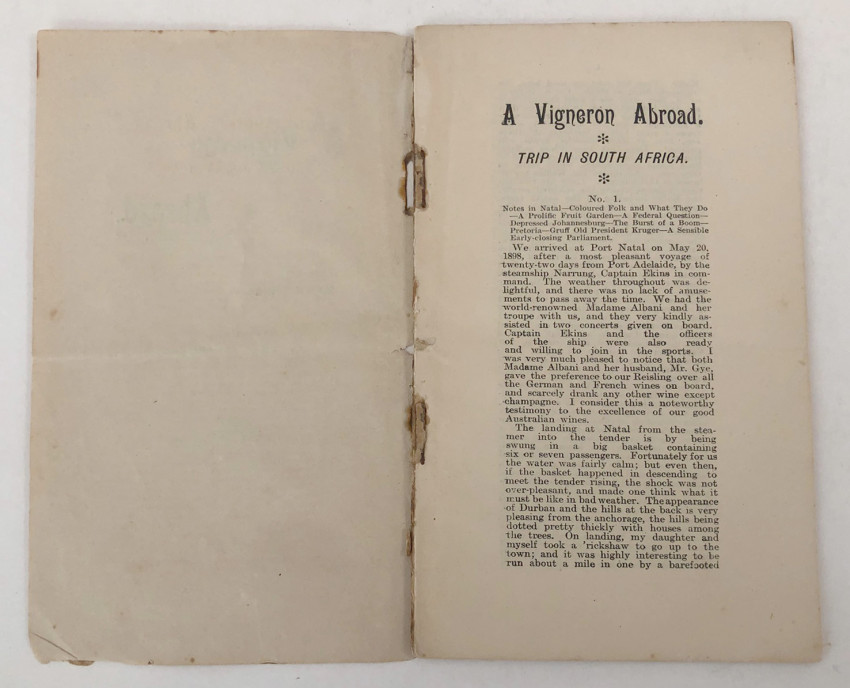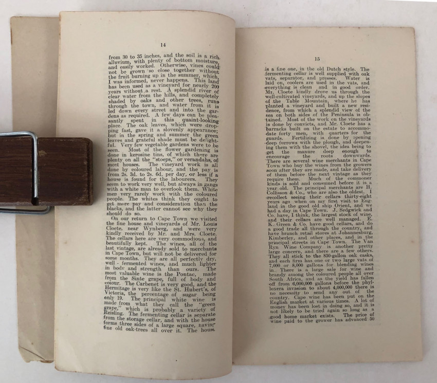 A rare 33pp. booklet, reprinted from The South Australian Register. Written by Thomas Hardy (no relation to the novelist), the “Father of the South Australian Wine Industry” about his trip to South Africa in the late eighteen hundreds, largely to explore the Cape wine industry and then, on his way home, that of France, Tunisia and England. In the Cape he spends some time with the Cloete’s of Groot Constantia and discusses their vineyards and wines in considerable detail. An early South African and Australian wine item. Not in SABIB and the only copy that I can trace is in the National Library of Australia.