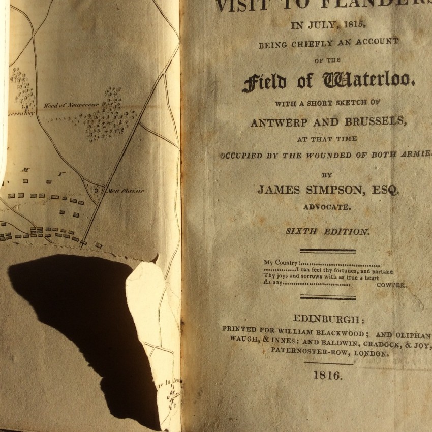 A Visit to Flanders in July 1815 (sixth edition 1816), the main book in the lot, was presented to the Officers' Mess, 5th Lancers, by Major J Hutchin in 1888. Half-bound in tan calf and marbled paper-board sides. Marbled endpapers and page edges. [iv] + x + 198 pp of text + [iv].