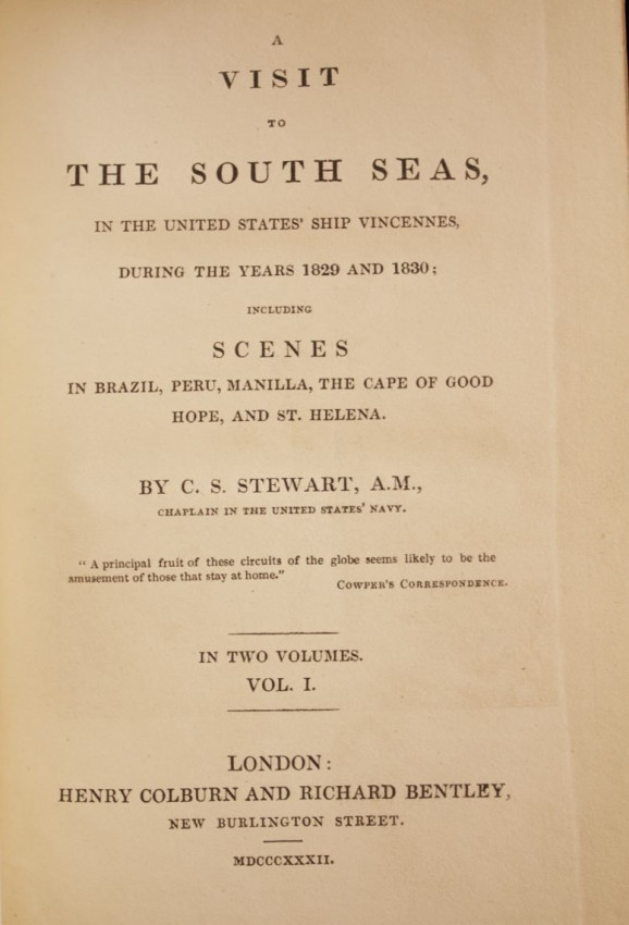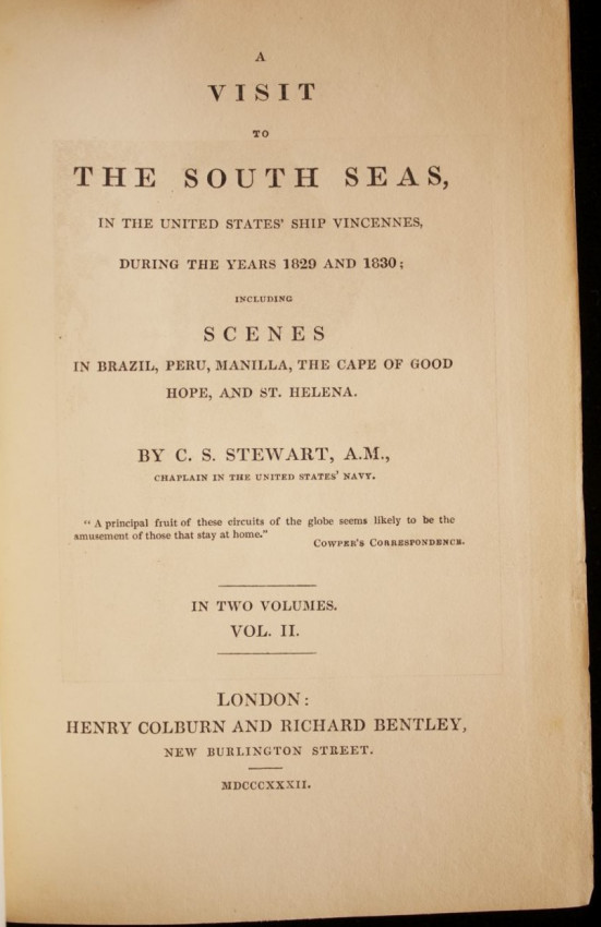 "A Visit To The South Seas, In The United States' Ship Vincennes, During The Years 1829 and 1830; Including Scenes in Brazil, Peru, Manilla, The Cape Of Good Hope, And St. Helena. By Charles Samuel Stewart, A. M., Chaplain In The United States' Army."