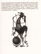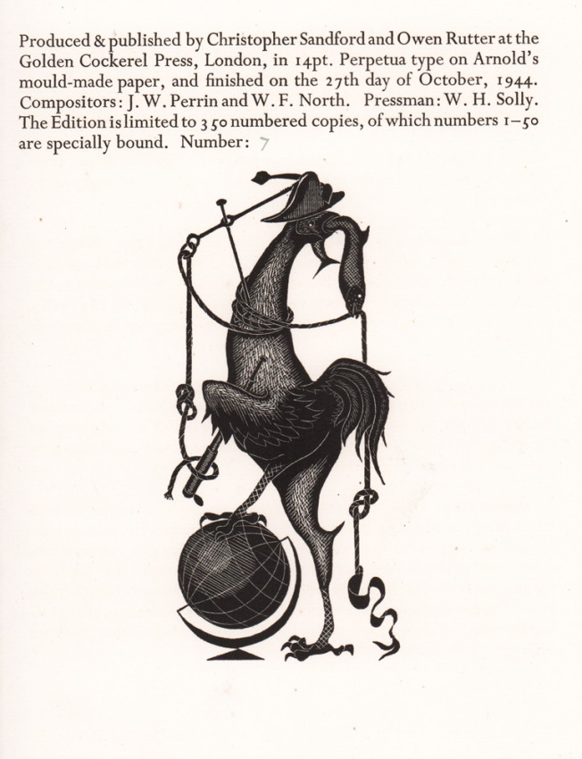 The colophon reads: Produced & published by Christopher Sandford and Owen Rutter at the Golden Cockerel Press, London in 14pt Perpetua type on Arnold’s mould made paper and finished on the 17th day of October 1944. This edition is limited to 350 numbered copies of which numbers 1 – 50 are specially bound. Number: 7