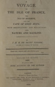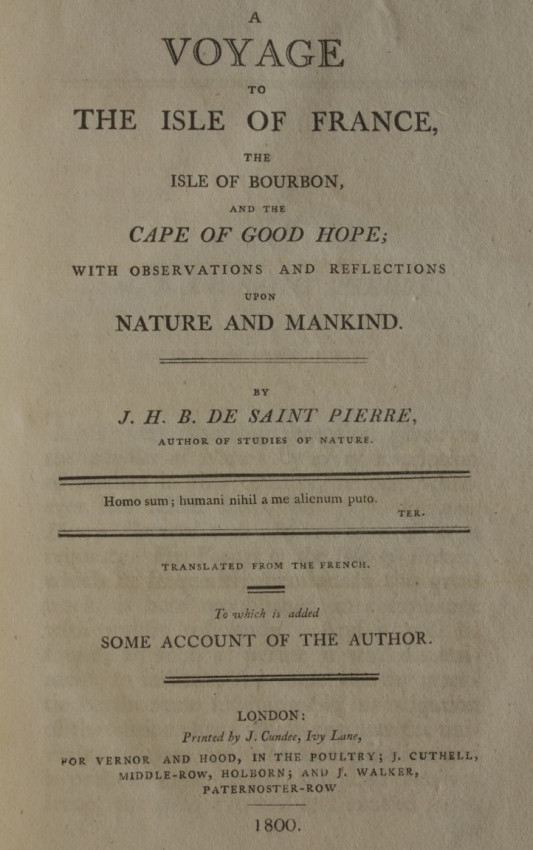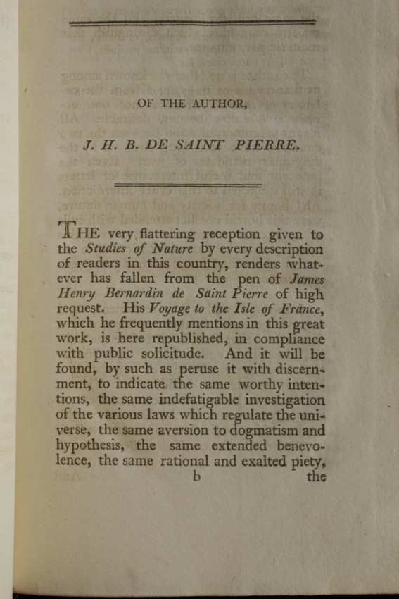 Jacques-Henri Bernardin de Saint Pierre was born on 19 January, 1737 and died on 21, January 1814. He was a well known French literary character who first published this book in French in 1773. The first English translation was published in 1775 under the title "A Voyage to the Island of Mauritius...etc." This translation, published in 1800, is a new and re-worked version of the 1775 edition.