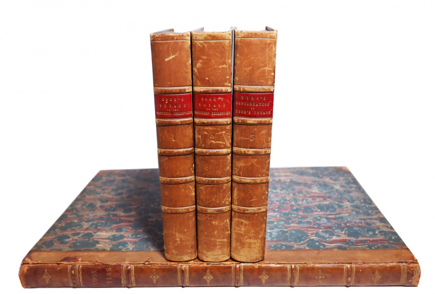 Together with: First edition: Folio volume: Cook’s Atlas to the Third Voyage. London, A. Strahan for G. Nicol and T. Cadell, 1784. There are 87 accompanying copper engraved plates and maps, some folding or double page, issued separately in this atlas (540 x380mm) without a title page or pagination. The binding of the Atlas is different to the 3 volumes of text with half calf marbled boards and red title label gilt on the spine. The covers are detached. There is slight water staining on the edges of several pages of the Atlas which do not affect the images. They are in good condition.