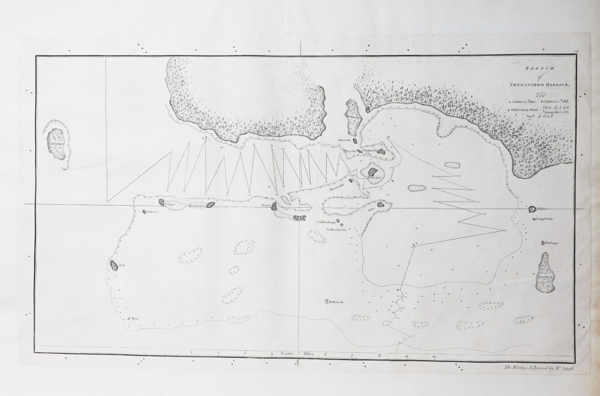 Second edition: 3 volumes : [10], xcvi, 421; [14], 548; [14], 556 pages, engraved vignettes of the Royal Society Medal on the title pages – Vol. I has Cook in profile; Vol. II has the verso of the same medal; Vol. III has Captain King. There are several maps bound into the body of these volumes which should be in the Atlas. Volume 1 has folding maps opposite page 91 and 225 and 277, volume 2 has a map opposite page 279, a folding map opposite page 466 and a folding coastal profile opposite page 470, and volume 3 has a folding map opposite page 1, a map opposite page 184 a folding coastal profile opposite page 312 as well as a folding letterpress table as Appendix 11, light foxing throughout, half tan calf with matching marbled boards, red title label gilt on the spines, a very good set.