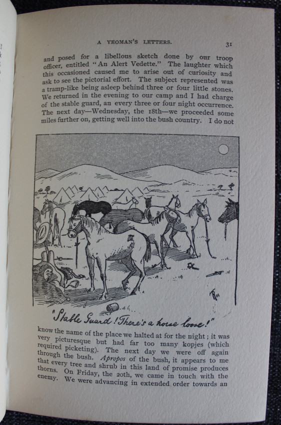 A humorous description of camp life in Sussex Yeomanry "on trek" with Generals Roberts and Clemens during a portian of the South African War. The illustrations are very comical, and depict in a graphic manner the author's experiences in the veld. The series of letters embrace the period from June 1900 to April 1901.