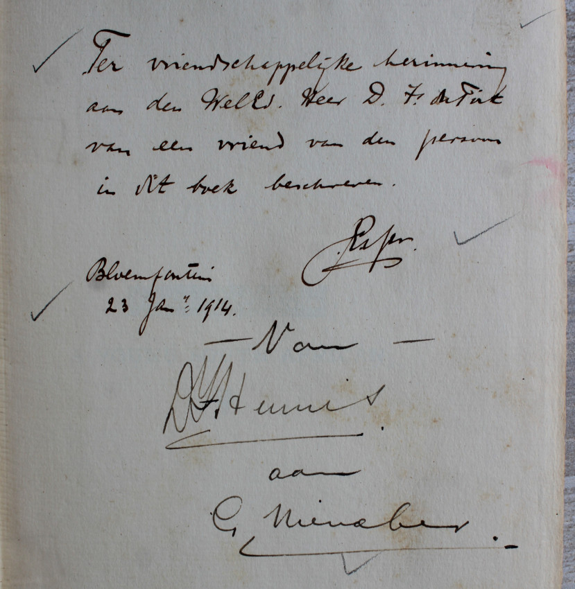 A nice inscription on ffep: Ter vriendschaplijke herinnering aan den Heer D. F. du Toit..... signed and dated 1914 at Bloemfontein. With signatures of a Heunis and Nienaber.