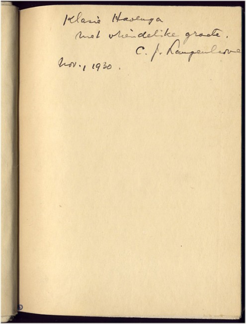 The inscription reads \'Klasie Havenga met vriendlike groete C.J. Langenhoven Nov.1 1930.\' Klasie was a nickname by which N.C Havenga parliamentarian and Union finance minister was known.