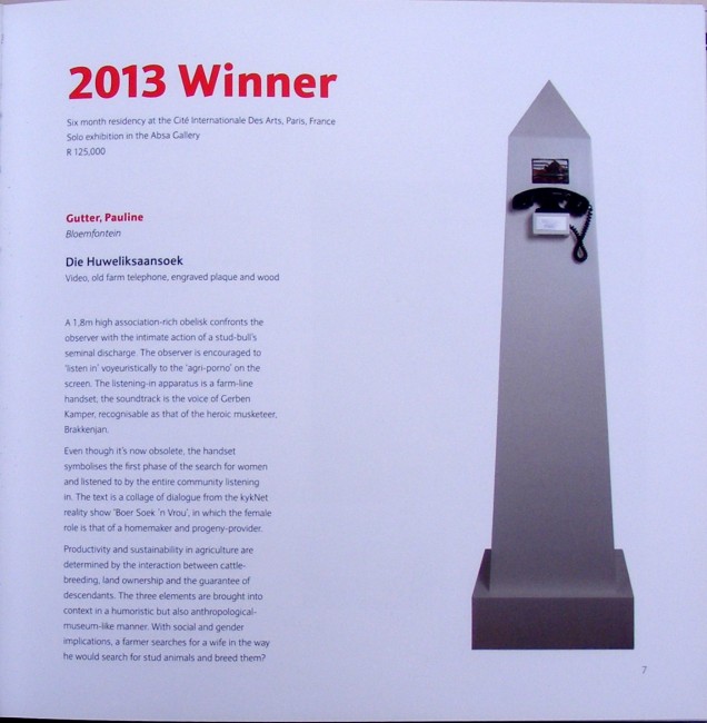 Tha Absa L'Atelier is a prestigious Annual Corporate Fine Art Competition. Previous winners include Penny Siopis, Clive Van Den Berg, Diane Victor, Conrad Botes and Ruth Sacks. Also Gerard Sekota Competition.