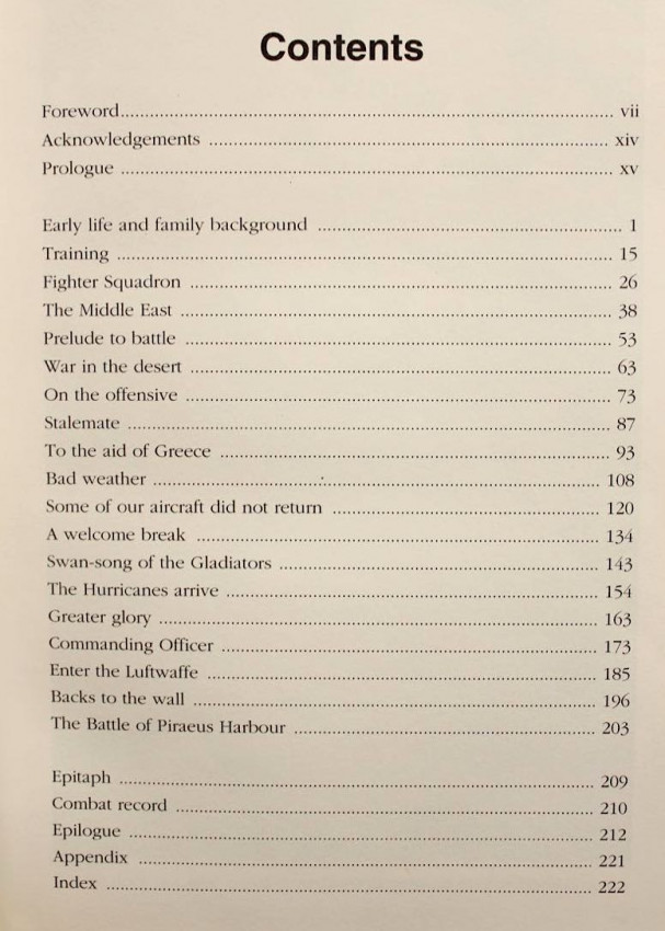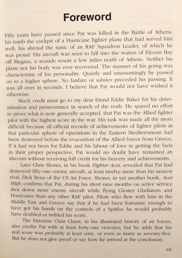 "Here is the story of an outstanding fighter pilot and a great leader of men, the unknown ace of the Royal Air Force. Pattle was born in the Cape and raised on a lonely farm in Namibia. He discovered early in his life a keen desire within him to fly. He was rejected by the South African Air Force in 1933, but became more determined than ever to achieve his ambition. Pattle left South Africa to join the Royal Air Force before the war and achieved a success out of all proportion to expectations. He did much to help the hard-pressed troops on the ground. On 20 April 1941, a sick man, he led the remnants of his own and another squadron against an armada of over a hundred German aircraft. In the desperate fighting that followed, he shot down at least two enemy aircraft and then dived to the rescue of one of his pilots. The odds were too heavy and seconds later his aircraft, with Pattle slumped over the controls, crashed in the Bay of Eleusis."