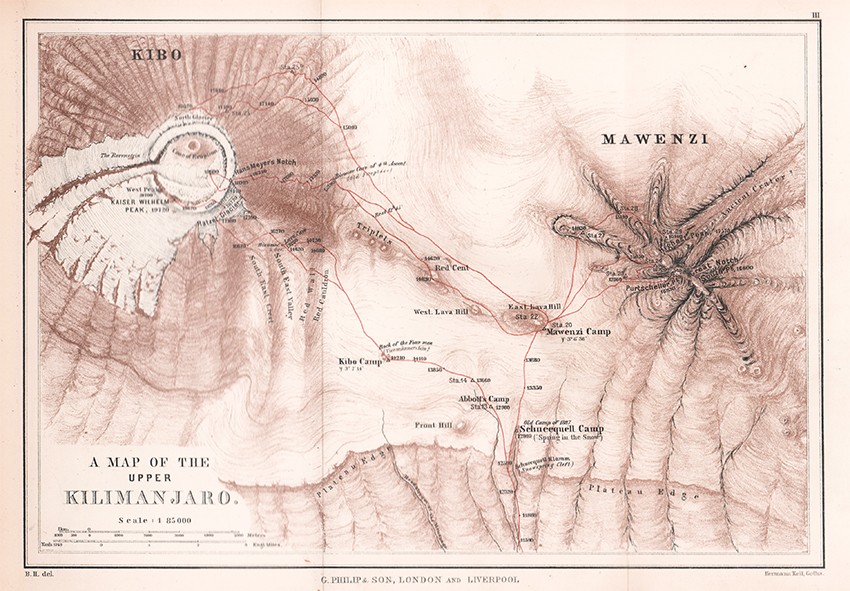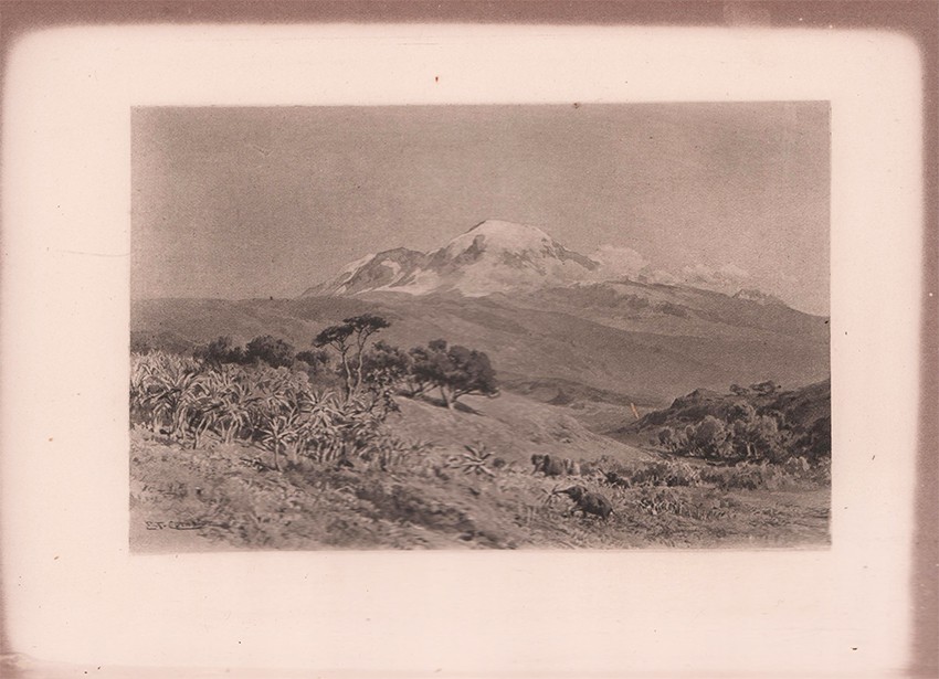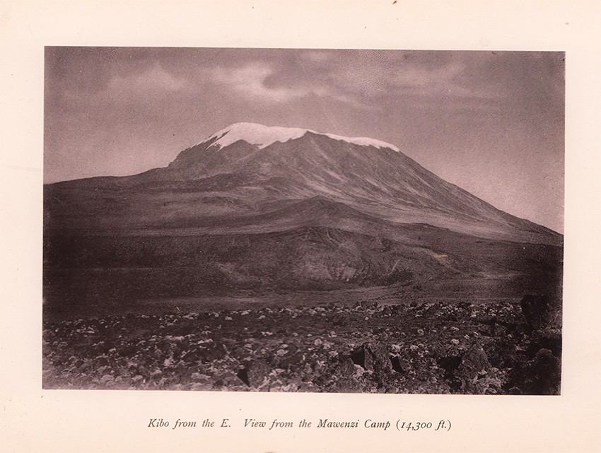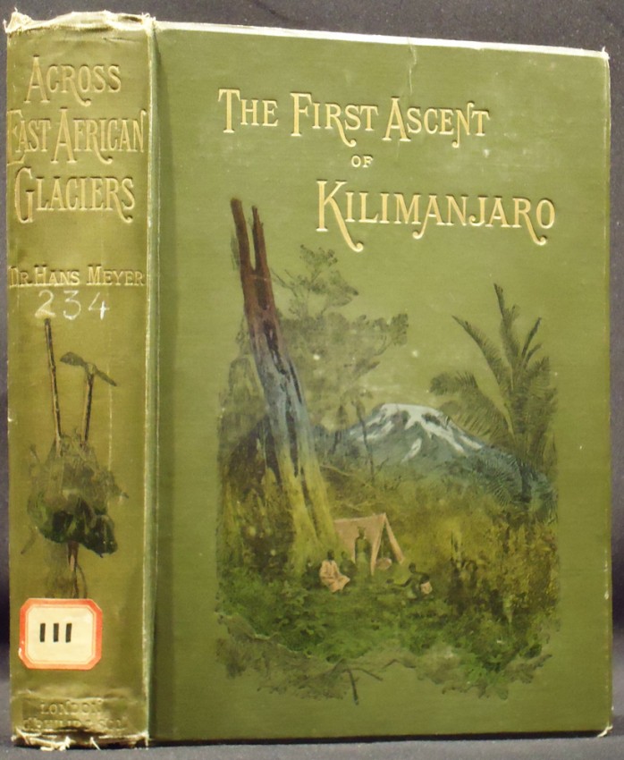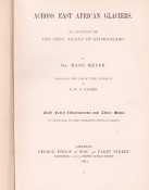 First Edition. 397 pages, frontispiece - a chromolithograph laid down – a general view of Kilimanjaro from the S.E., 8 sepia toned photographs tipped in, 12 photogravure plates oxidised at the edges as usual, 20 text illustrations, some pages are loose, ex library with the usual library labels and stamps, original pictorial green cloth with bevelled edges, top edge gilt, others uncut, titled gilt on the upper cover and spine, which is worn and faded.