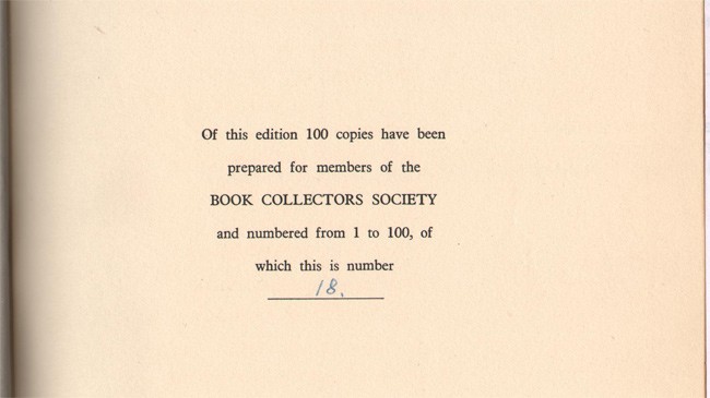 Of this edition 100 copies have been prepared for members of the Book Collectors Society and numbered from 1 to 100, of which this is number 18.
