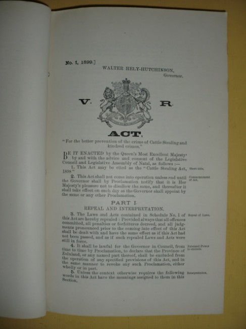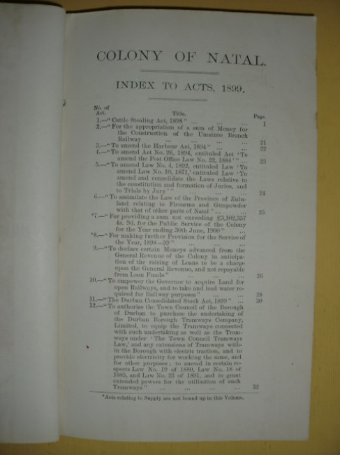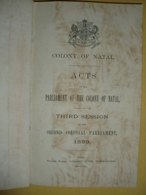 'Colony of Natal - ACTS of the Parliament passed in the Third Session of the Second Colonial Parliament, 1899.' 227pp. 'blue book' recording sessions to do with subjects such as: Cattle Stealing Act (1898), Construction of the Umzinto Branch Railway, amendment to the Harbour Act (1894), amendment to the Post Office Law No.22 (1884), the Law of the Province of Zululand relating to Firearms and Gunpowder..., raising of Loans for General Revenue of the Colony, Acquiring of land for open Railways and Tramways, Shipping Act (1899), laying of wires for Electric Lighting, to amend the Law of Trespass, the Newcastle Corporation Loan Act (1899), Animal Diseases Act, the Liquor Act, better protection of Women and Children,