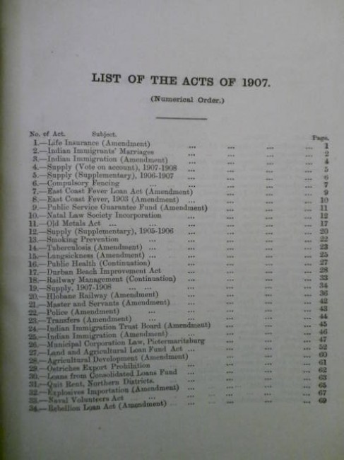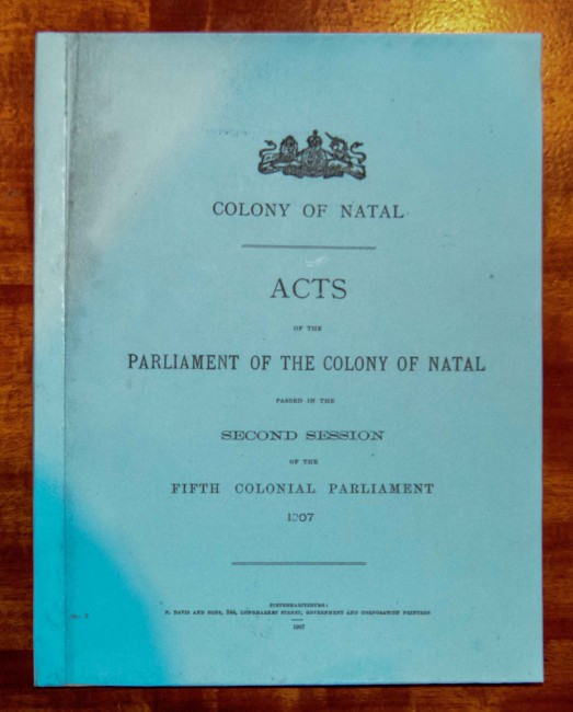 As in the case of the previous lot, this item has been rebound in new pale-blue wraps, with the cover wording copied from the title page. The iv + 69 pp include 2 indexes and the text of 34 Acts. [These range from Agricultural Development to Tuberculosis (Amendment) and include (cf Lot 315) two Indian Immigration Amendment Acts, the Indian Immigrants' Marriages Act and and the Indian Immigration Trust Board Amendment Act.]