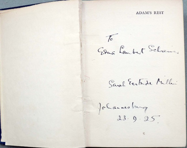 First edition of this early Millin work and considered by some to be her best novel. This is an interesting association copy, inscribed by the author to Edna Lambert Schreiner and dated 23.9.25. She was the wife of Justice Oliver Denys Schreiner, son of Olive Schreiner's brother W.P. Schreiner, and one time Vice Chancellor of Wits University. The original cloth is somewhat worn and the joints are rather tender. However, internally the book is clean and tight.