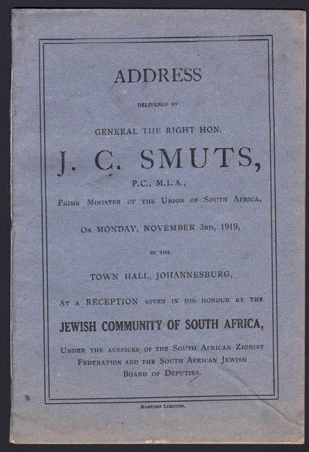 Prime Minister of the Union of South Africa, on Monday, November 3rd 1919 in the Town Hall, Johannesburg, at a Reception given in his honour by the Jewish Community of South Africa, Under the Auspices of the South African Zionist Federation and the South African Jewish Board of Deputies.