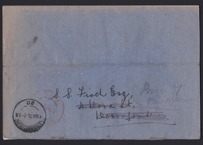 18 pages, 180 x 120 mm, printed blue paper wrappers, addressed to S.S. Fisch, Esq., on the back cover and with a postmark dated Johannesburg, 4 March 1920.