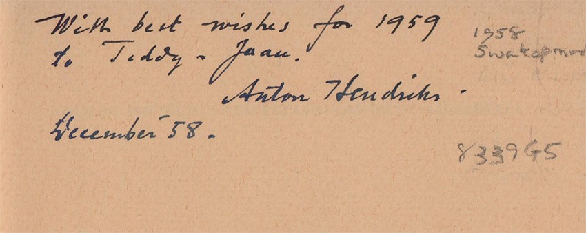 Inscription on the front free end paper reads: With best wishes for 1959 to Teddy and Joan. Anton Hendriks December 1958