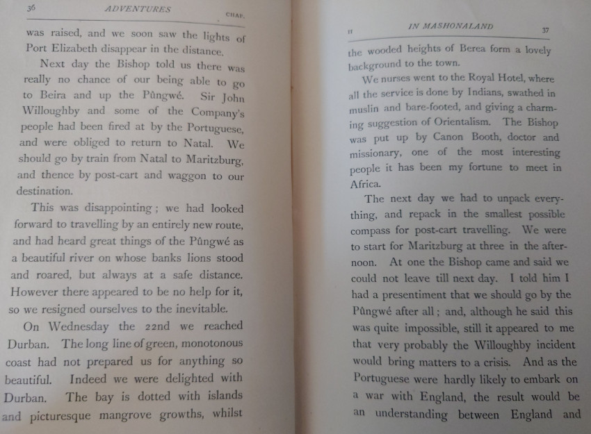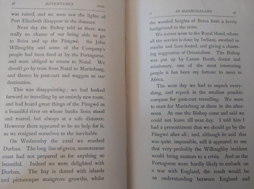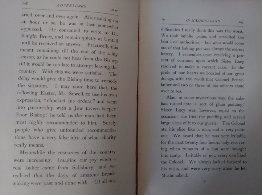 Written by Rosanna ('Rose') Blennerhassett (c.1844–1907), the daughter of baronet Sir Arthur Blennerhassett, this work of 1893 recounts the adventures of two Anglican nurses who worked in Umtali (now Mutare in northern Zimbabwe). In 1890 Blennerhassett sailed to Johannesburg to nurse victims of a typhoid outbreak, meeting Lucy Sleeman on board. At the end of their period of service, the pair opted to go north into Mashonaland rather than returning to England. They undertook a two-week journey of 190 miles on foot in the bush from the Pungwe river to Umtali, where they established the first hospital, in a series of beehive-shaped mud huts. The pair remained there for two years, often working without a doctor. The book recounts every aspect of their daily adventures, from baking cakes and constructing coffins out of whisky cases to bizarre encounters with witch hunters, a man-eating lion, and Cecil Rhodes.