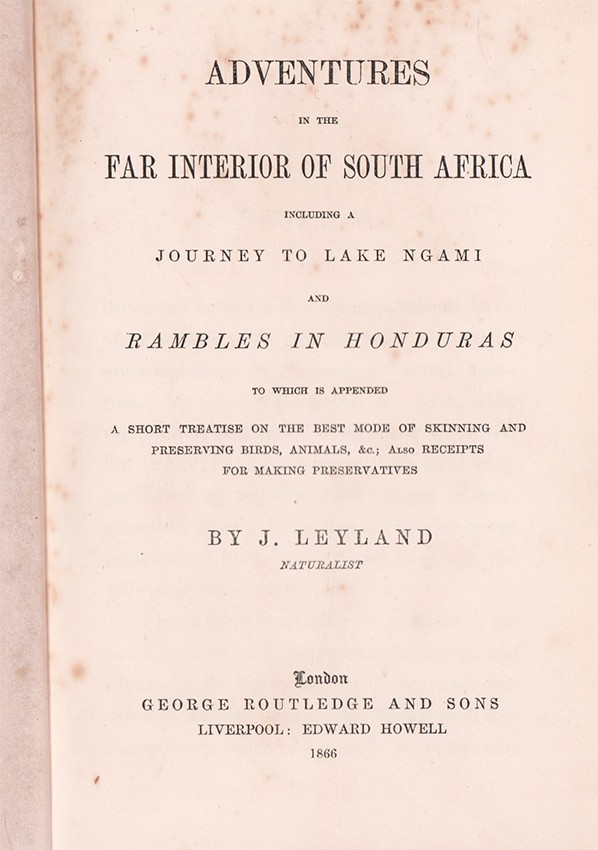 Mendelssohn (Sidney) South African Bibliography, volume 1, page 897: 'An account of three journeys in South Africa in the middle of the nineteenth century (1848-1852). The author arrived in Algoa Bay in September 1848, and two months later proceeded to "Graham's Town", where he remained for ten months, engaged in "shooting, collecting, and preserving birds". He then journeyed to Graaff-Reinet, where a hunting expedition was planned to Lake N'gami, but some dissensions breaking out among the party, the trip was abandoned, and Leyland, and Mr. Nicholson (author of "The Cape and its Colonists", who formed one of the expedition) returned to Algoa Bay.