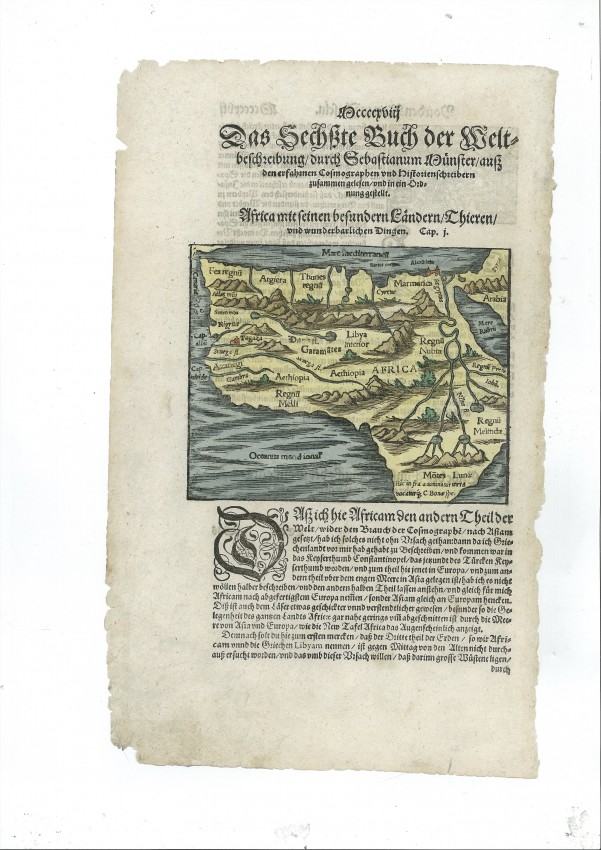 This is a fascinating 16th century, hand-coloured map of most of Africa by Sebastian Münster from his Cosmographia, the most popular book of the century - and the map has a rather gruesome image on the verso.